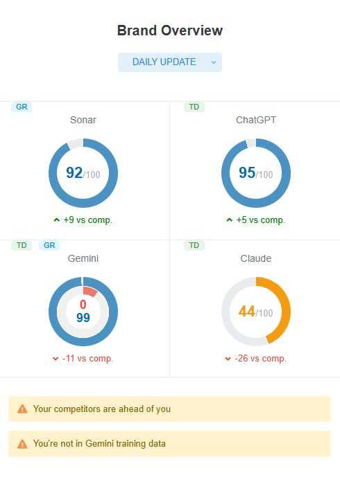 - Stebėkite savo prekės ženklo pasirodymus ChatGPT, Google Gemini, Claude ir Perplexity.